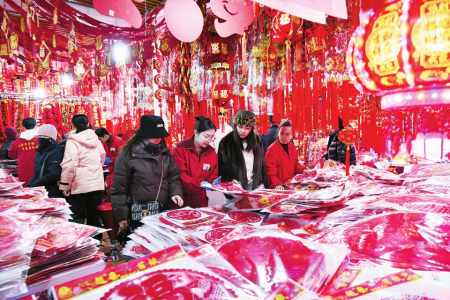 “今年蛇年,對聯(lián)和掛飾肯定以蛇元素為主,品類更加豐富,背膠和磁吸設(shè)計,掛貼更為方便。”在太原某大賣場,邢先生售賣春聯(lián)和窗花、燈籠等各類春節(jié)掛飾20多年了,一副副大紅的春聯(lián)掛滿了兩面墻壁,各類福字和掛飾鋪滿了整個攤位,顧客們正在選購自己喜歡的春聯(lián)和掛飾。他說,今年的春聯(lián)和春節(jié)掛飾有大幾百種,豐富多樣。臘八過后,來購買對聯(lián)和過年掛飾的人就開始多了起來,預(yù)計年前一周左右會達(dá)到高峰。