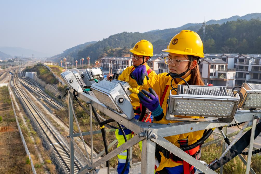3月7日,中國鐵路昆明局集團(tuán)有限公司“00后”女電工王華欽(右一)在中老鐵路寧洱站貨運(yùn)場(chǎng)檢修燈塔(無人機(jī)照片)。新華社發(fā)(殷學(xué)合 攝)