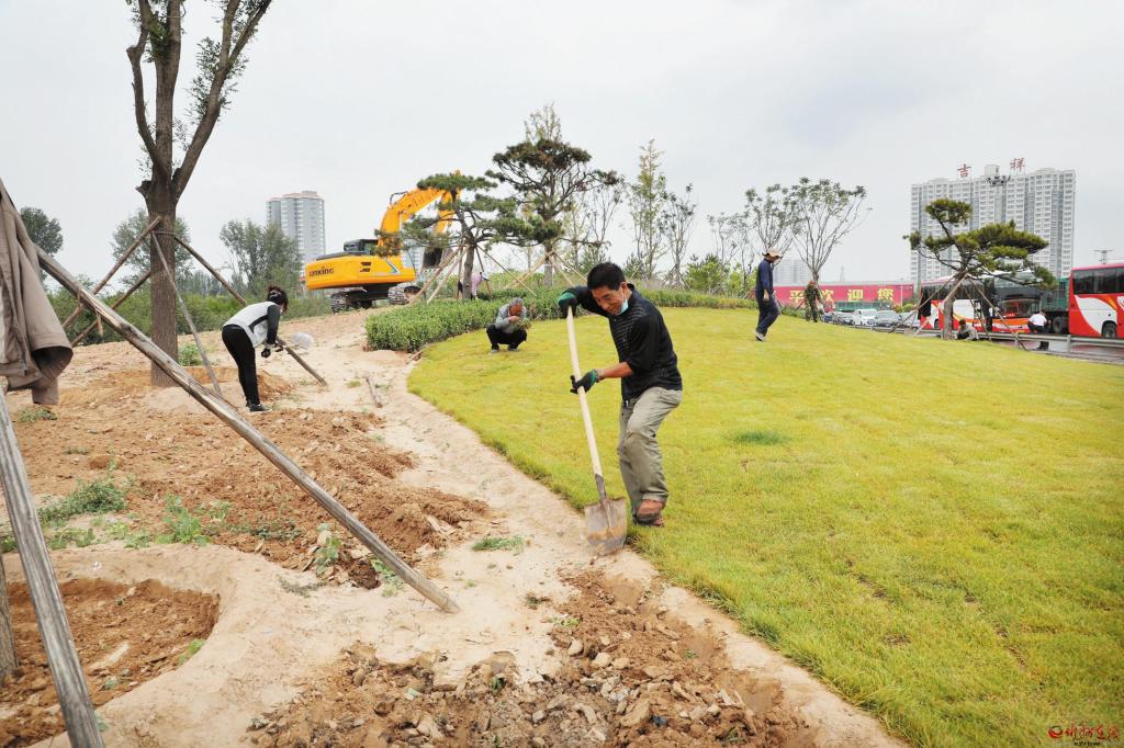 9月14日,原平市高速路口兩側(cè)的綠化工作正在如火如荼地進(jìn)行著。挖掘機(jī)揮舞著鐵臂挖掘土壤,數(shù)十名工人忙碌著搬運花草,栽植樹木。據(jù)了解,該市今年綠化工程總投資1.3億元,對范亭廣場、原平經(jīng)濟(jì)技術(shù)開發(fā)區(qū)、高速路口兩側(cè)及新華廣場、崞紅線進(jìn)行綠化提升改造,喬、灌、花、草合理組配,達(dá)到增層、增色、增花的效果。(褚 震 攝)