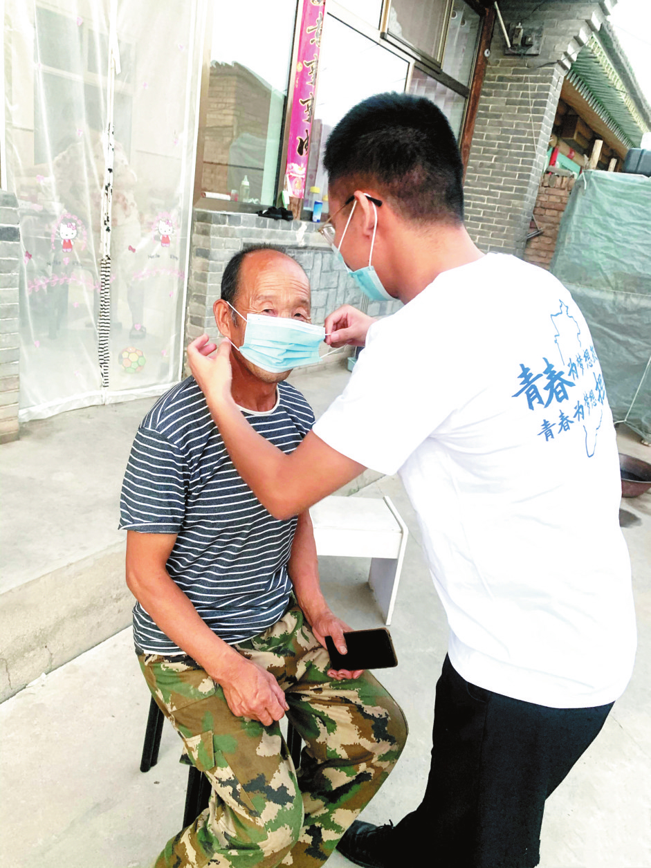健康生活,鄉(xiāng)村有我。圖為建行忻州分行青年員工深入農(nóng)村教村民正確佩戴口罩,增強(qiáng)防疫意識(shí)。 (朱 敏 攝)