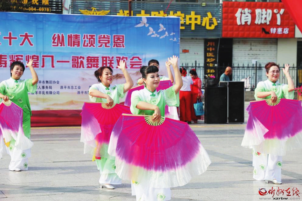 上午8時(shí),在現(xiàn)場(chǎng)觀眾的歡呼聲中,歌舞聯(lián)歡會(huì)激情開幕。城西社區(qū)藝術(shù)鑼鼓隊(duì)首先上場(chǎng),激越的鼓點(diǎn)鏗鏘有力、澎湃高亢,打出了振原平雄風(fēng)、鑄原平輝煌的雄心壯志;旗韻模特藝術(shù)協(xié)會(huì)的廣場(chǎng)舞《唱支山歌給黨聽》,舞姿翩翩、悠揚(yáng)情深;廣場(chǎng)舞《我和我的祖國》,體現(xiàn)了“祖國偉大,我愛祖國”的主題;廣場(chǎng)舞《盛世歡歌》《共筑中國夢(mèng)》,深情抒發(fā)了同心共筑中國夢(mèng)的時(shí)代激情;快樂健身舞蹈隊(duì)的《扇子舞》,別出心裁,特色鮮明;原平市大金操隊(duì)的廣場(chǎng)舞《火了 火了 中國》和觀眾發(fā)生強(qiáng)烈共鳴,現(xiàn)場(chǎng)許多人情不自禁舞動(dòng)起來。聯(lián)歡會(huì)以團(tuán)結(jié)協(xié)作、勇敢奮進(jìn)為精神,向八一建軍節(jié)獻(xiàn)禮高歌。