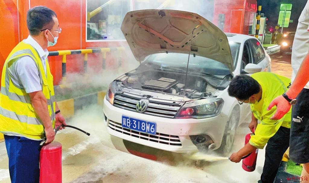8月22日21時05分,忻州高速忻州收費(fèi)站出口83車道,一輛私家白色小轎車在等待通行過程中機(jī)蓋及左前側(cè)霧燈處突然冒煙躥出火苗,監(jiān)控員石桂平在顯示屏上看到后立即通過對講機(jī)告知值班站長周麗青和當(dāng)班帶班班長白羽鴻,讓其迅速前往83車道對起火車輛進(jìn)行處置。收到信息后,帶班班長立即帶領(lǐng)應(yīng)急人員對車輛進(jìn)行滅火處置,值班站長帶領(lǐng)安全員趕往現(xiàn)場,及時疏散臨近車輛并關(guān)閉車道,以防其他鄰近車輛連帶受損?;鹎橄?,工作人員將車輛快速推移至外廣場安全地帶并等待車輛起火溶解處冷卻,觀察無安全隱患后才離開。