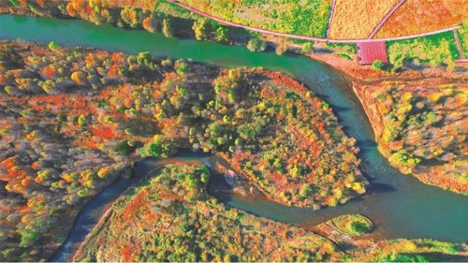 10月14日,航拍鏡頭下的靜樂汾河川國(guó)家濕地公園,秋意濃濃,景美如畫。 本報(bào)記者 張存良攝