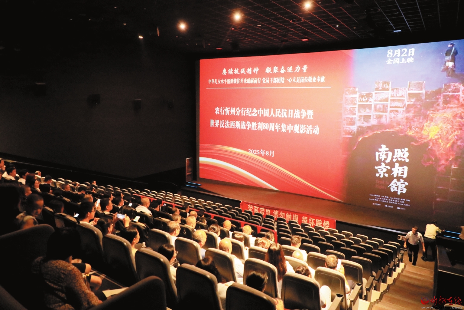 為紀(jì)念中國人民抗日戰(zhàn)爭暨世界反法西斯戰(zhàn)爭勝利80周年,8月22日,農(nóng)行忻州分行組織市分行機(jī)關(guān)及城區(qū)支行的黨員干部聯(lián)合開展了以“賡續(xù)抗戰(zhàn)精神,凝聚奮進(jìn)力量”為主題的黨日活動,并集體觀看了電影《南京照相館》。(殷俊攝)