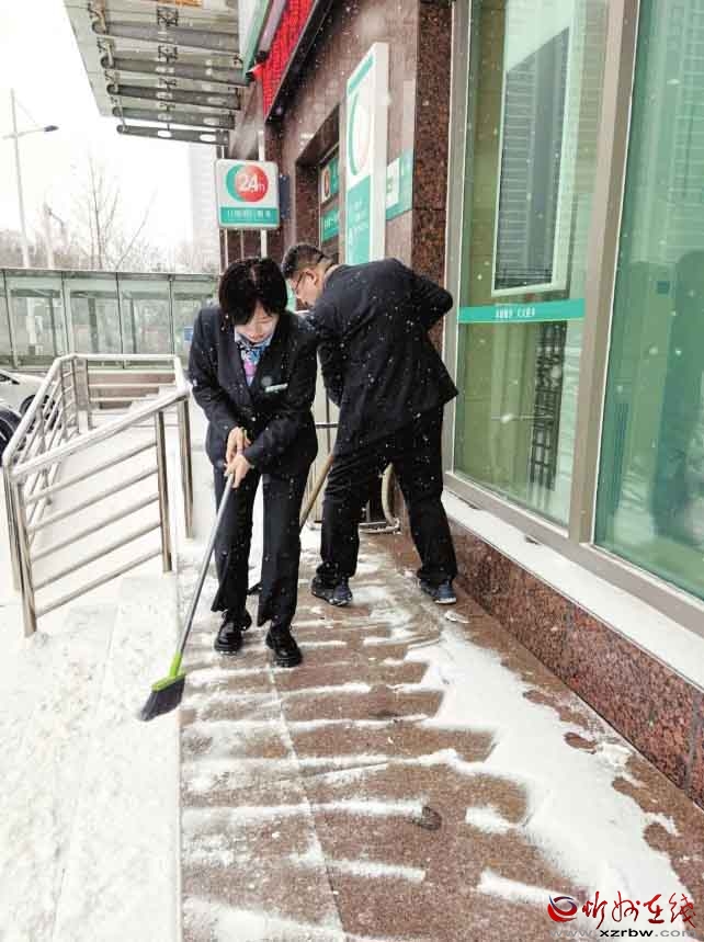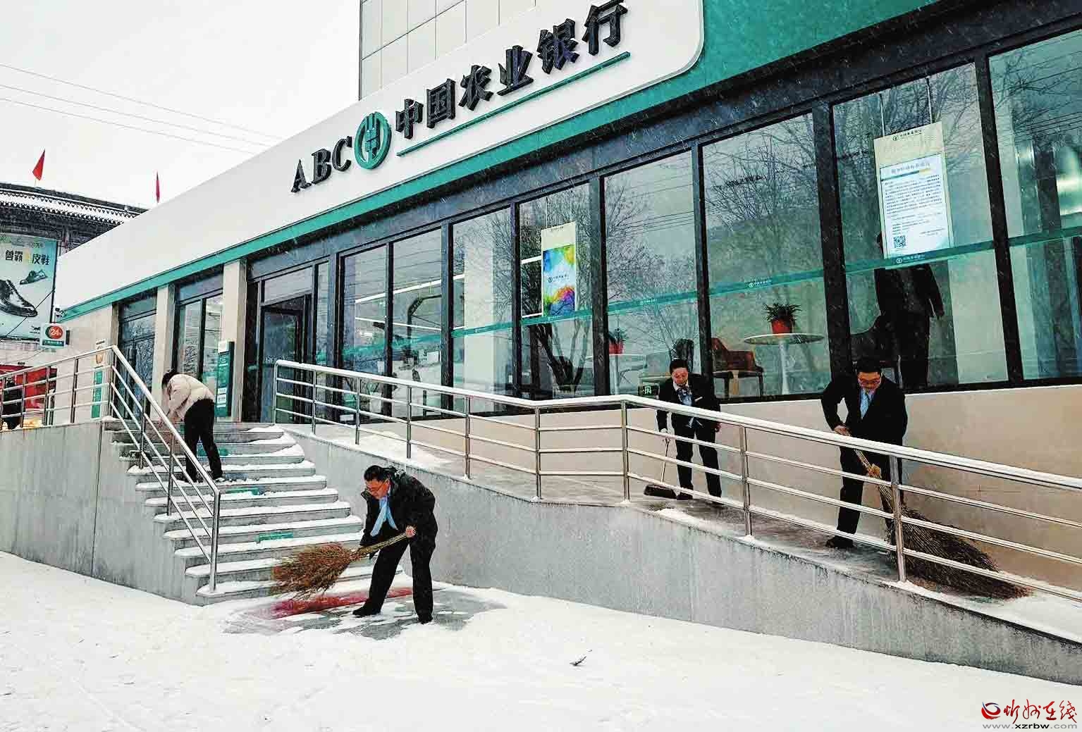 面對(duì)我市首場(chǎng)強(qiáng)降雪,農(nóng)行忻州分行員工以雪為令,及時(shí)清掃網(wǎng)點(diǎn)及周邊區(qū)域,確保服務(wù)通道暢通無(wú)阻,以實(shí)際行動(dòng)傳遞了溫暖的金融服務(wù)。(殷俊攝)