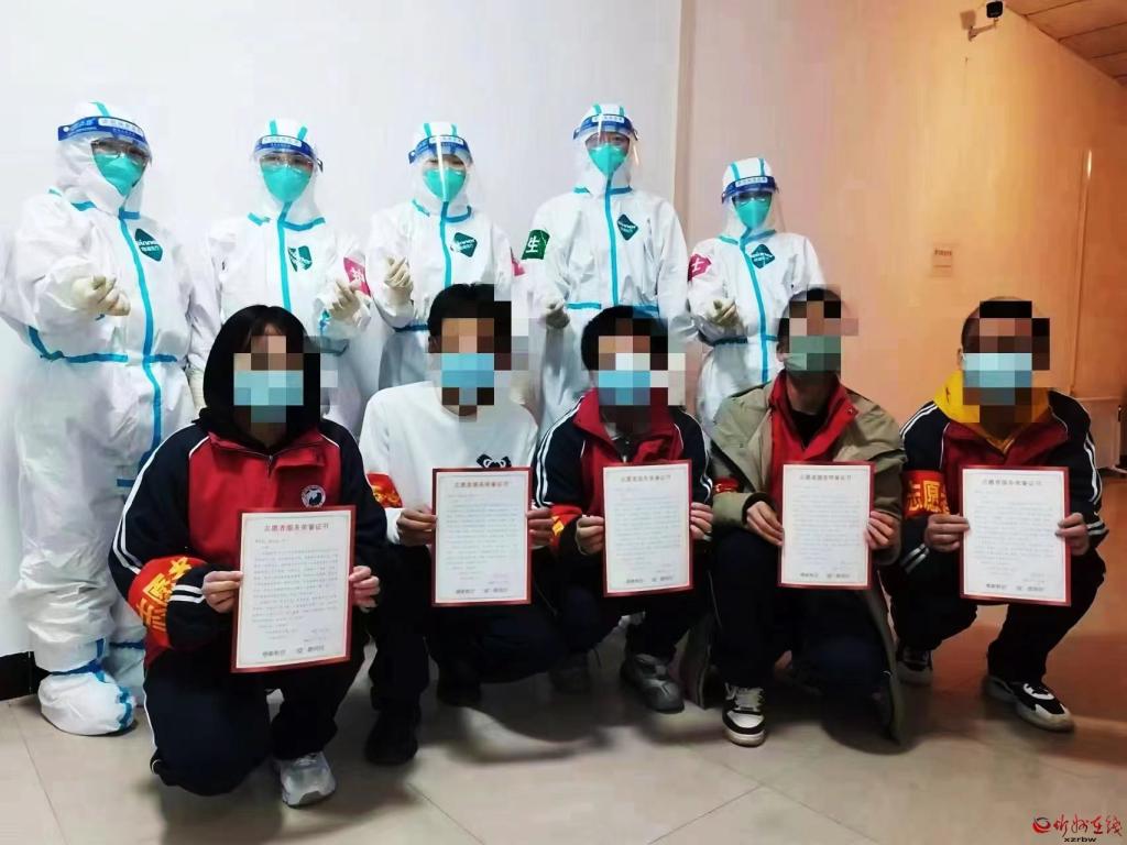 “大白”與方艙內(nèi)志愿者服務(wù)榮譽(yù)證書(shū)的獲得者在一起
