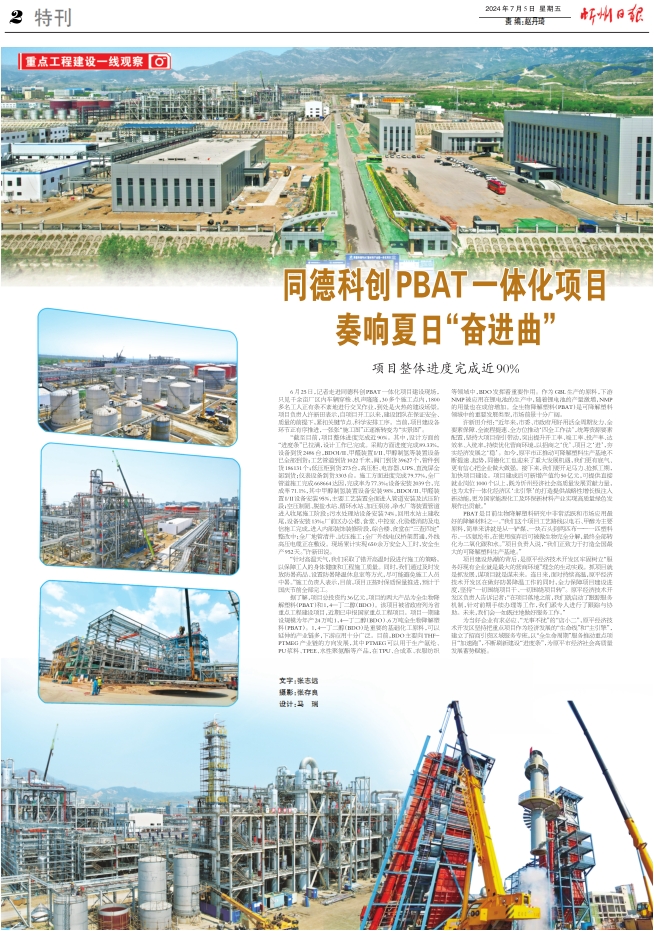 6月25日,記者走進(jìn)同德科創(chuàng)PBAT一體化項(xiàng)目建設(shè)現(xiàn)場(chǎng),只見(jiàn)千余畝廠區(qū)內(nèi)車(chē)輛穿梭、機(jī)聲隆隆,30多個(gè)施工點(diǎn)內(nèi),1800多名工人正有條不紊地進(jìn)行交叉作業(yè),到處是火熱的建設(shè)場(chǎng)景。項(xiàng)目負(fù)責(zé)人許新田表示,自項(xiàng)目開(kāi)工以來(lái),建設(shè)團(tuán)隊(duì)在保證安全、質(zhì)量的前提下,緊扣關(guān)鍵節(jié)點(diǎn)、科學(xué)安排工序。當(dāng)前,項(xiàng)目建設(shè)各環(huán)節(jié)正有序推進(jìn),一張張“施工圖”正逐漸轉(zhuǎn)變?yōu)椤皩?shí)景圖”。