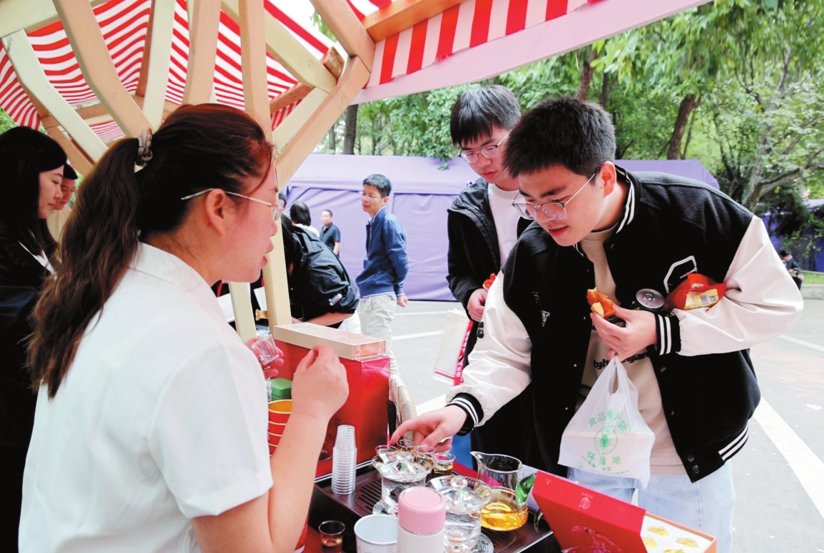 我市在清華大學(xué)國防教育林舉辦秋季學(xué)期學(xué)生地域文化節(jié)暨“人到山西好風(fēng)光”忻州專場活動(dòng)。圖為清華大學(xué)學(xué)生品嘗毛建茶。本報(bào)記者范琛攝