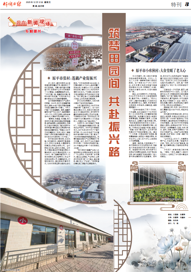 張村地處城鄉(xiāng)接合部,區(qū)位優(yōu)越,東鄰滹沱河,南接原平高速路出口,西鄰大運(yùn)高速,北靠國家電投集團(tuán)山西鋁業(yè)有限公司。全村耕地2400畝,全部為水澆地。近年來,村集體通過多種渠道發(fā)展壯大集體經(jīng)濟(jì),2023年集體經(jīng)濟(jì)收入20萬余元。除了蓮藕種植項(xiàng)目外,村黨支部牽頭成立智聚民心農(nóng)業(yè)開發(fā)服務(wù)有限公司,購置拖拉機(jī)、打捆機(jī)等農(nóng)機(jī),通過服務(wù)托管的方式,為本村和周邊群眾提供社會(huì)化服務(wù)?!敖衲晖瓿汕锔?000余畝,為村集體增收10萬余元;盤活閑置門面房出租,年增收4.5萬元;出租集體機(jī)動(dòng)地,增收5萬元;光伏發(fā)電年增收5000余元。”弓潤鎖,這位老支書飽含感情且語氣堅(jiān)定地對(duì)記者說,“我們要讓每寸土地都發(fā)揮最大效益,讓村民共享發(fā)展成果?!?/p>