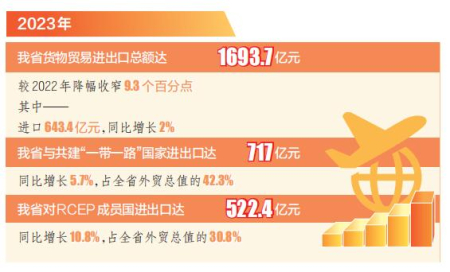 本報訊(記者孟婷)2月14日,記者從太原海關獲悉,據統計,2023年我省貨物貿易進出口總額達1693.7億元,較2022年降幅收窄9.3個百分點。其中,進口643.4億元,同比增長2%。同期,我省與共建“一帶一路”國家進出口達717億元,同比增長5.7%,占全省外貿總值的42.3%。我省對RCEP成員國進出口達522.4億元,同比增長10.8%,占全省外貿總值的30.8%。