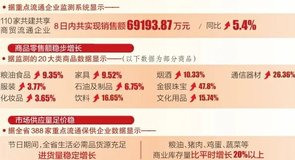 商品零售額穩(wěn)步增長(zhǎng)。各市結(jié)合消費(fèi)者追求綠色健康、彰顯個(gè)性多樣、青睞科技智能等方面的消費(fèi)新需求,通過(guò)發(fā)放政府電子消費(fèi)券或指導(dǎo)商圈集聚營(yíng)銷、品牌商品展銷、特色商品促銷等形式,持續(xù)拉動(dòng)消費(fèi)增長(zhǎng)。據(jù)了解,全省各大商場(chǎng)節(jié)日禮盒、時(shí)令水果、糖果糕點(diǎn)、地方土特產(chǎn)、健康保健品、牛奶、飲料、煙酒等銷售旺盛。據(jù)監(jiān)測(cè)的20大類商品數(shù)據(jù)顯示,糧油食品、服裝、化妝品、家具、石油及制品同比分別增長(zhǎng)9.35%、3.77%、3.65%、9.52%和6.75%;飲料、煙酒、金銀珠寶、文化用品、通信器材等實(shí)現(xiàn)了兩位數(shù)以上的增長(zhǎng),分別為16.65%、10.33%、47.8%、15.74%和26.36%。