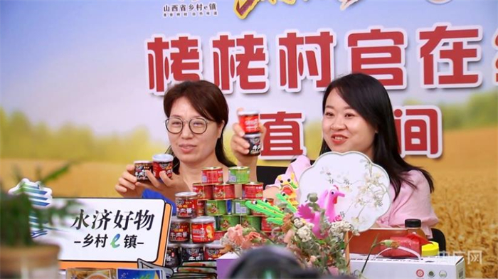 永濟(jì)市栲栳鎮(zhèn)鄉(xiāng)村e(cuò)鎮(zhèn)里,主播正在銷(xiāo)售當(dāng)?shù)剞r(nóng)特產(chǎn)品(央廣網(wǎng)發(fā) 永濟(jì)市融媒體中心供圖)