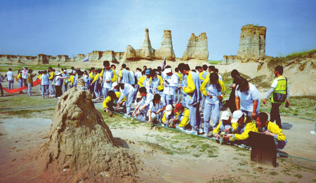 前來研學(xué)的學(xué)生們近距離觀察地貌。資料圖片
