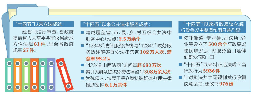 “十四五”期間,我省堅(jiān)持改革和法治相統(tǒng)一,確保重大改革于法有據(jù)?!笆奈濉币詠?,經(jīng)省司法廳審查,省政府提請(qǐng)省人大常委會(huì)審議省級(jí)地方性法規(guī)61件,出臺(tái)省政府規(guī)章27件,《山西省煤炭清潔高效利用促進(jìn)條例》《山西省旅游發(fā)展促進(jìn)條例》對(duì)深入推進(jìn)能源革命,加快把文化旅游業(yè)培育成為支柱產(chǎn)業(yè),助力資源型經(jīng)濟(jì)轉(zhuǎn)型發(fā)展提供了制度支撐?!渡轿魇↑S河流域生態(tài)保護(hù)和高質(zhì)量發(fā)展條例》將生態(tài)環(huán)境保護(hù)實(shí)踐中行之有效的政策制度,通過行政立法及時(shí)上升為法律制度,用法治力量讓母親河水量豐起來、水質(zhì)好起來、風(fēng)光美起來。