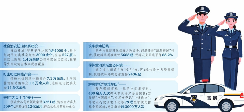 12月9日上午,中共山西省委宣傳部、山西省人民政府新聞辦公室舉行“高質(zhì)量完成‘十四五’規(guī)劃”系列主題第十七場新聞發(fā)布會,省公安廳有關(guān)負(fù)責(zé)同志介紹情況,并回答記者提問。 公安工作一頭連著黨和國家工作大局,一頭連著人民群眾平安福祉。“十四五”以來,全省公安機(jī)關(guān)錨定防風(fēng)險、保安全、護(hù)穩(wěn)定、促發(fā)展的核心任務(wù),以雷霆之勢嚴(yán)打各類違法犯罪,以暖心之舉優(yōu)化便民利企舉措,全力護(hù)航全省轉(zhuǎn)型發(fā)展大局,為全省經(jīng)濟(jì)社會發(fā)展?fàn)I造了安全穩(wěn)定的社會環(huán)境。 排隱患防風(fēng)險 平安底色更鮮亮 “十四五”以來,全省公安機(jī)關(guān)堅持總體國家安全觀,持續(xù)深化反顛覆反滲透反分裂反恐怖斗爭,實現(xiàn)系列重大安?;顒尤f無一失、各個節(jié)日節(jié)點平穩(wěn)度過,堅決捍衛(wèi)了國家政治安全。 省公安廳黨委副書記、主持日常工作的副廳長朱炳文介紹,全省公安機(jī)關(guān)始終把捍衛(wèi)政治安全擺在首位,以“時時放心不下”的責(zé)任感排隱患、防風(fēng)險,持續(xù)開展“百萬警進(jìn)千萬家”活動,努力將風(fēng)險化解在基層、消除在萌芽狀態(tài)。加強(qiáng)安全生產(chǎn)監(jiān)管,緊盯民爆物品、道路交通等重點領(lǐng)域,排查整治各類風(fēng)險隱患,全省較大道路交通事故較“十三五”同期下降38.7%,連續(xù)7年未發(fā)生民爆物品爆炸事故。 持續(xù)推進(jìn)社會治安防控體系建設(shè),推動建成“智慧安防小區(qū)”近4000個,指導(dǎo)組建平安類社會組織3000余個,全省527家二級以上醫(yī)院、1.4萬余輛公交車駕駛區(qū)監(jiān)控、報警等安防設(shè)施基本實現(xiàn)全覆蓋。持續(xù)做好校園周邊環(huán)境治理、社會面巡邏防控等各項工作,學(xué)生上下學(xué)、群眾夜宵、生病就醫(yī)、假期出游都有警察守護(hù),警燈常亮、警車常巡、警力常在,讓人民群眾感受到平安就在身邊。 重拳打擊護(hù)民安 平安答卷可感知 公安工作的出發(fā)點和落腳點是守護(hù)群眾安全,群眾安全感的提升是檢驗公安工作成效的核心標(biāo)尺?!笆奈濉币詠?,全省公安機(jī)關(guān)始終把打擊鋒芒對準(zhǔn)群眾反映強(qiáng)烈的突出違法犯罪,全省治安案件、刑事案件立案數(shù)大幅下降,命案發(fā)案率持續(xù)走低,集中攻破一批陳年命案。 省公安廳黨委委員、副廳長曾濤表示,全省公安機(jī)關(guān)緊盯涉黑涉惡、電信網(wǎng)絡(luò)詐騙、黃賭毒等突出違法犯罪,精準(zhǔn)發(fā)力、重拳出擊,以看得見的打擊戰(zhàn)果、摸得著的平安保障筑牢平安防線。 堅決鏟除黑惡犯罪這一社會毒瘤,偵破涉黑涉惡案件212起,一大批作惡多端、盤根錯節(jié)的黑惡勢力得到徹底鏟除。堅決遏制電信網(wǎng)絡(luò)詐騙犯罪高發(fā)勢頭,偵破電信網(wǎng)絡(luò)詐騙案件7.1萬余起,日均預(yù)警勸阻受騙群眾1.3萬余人次,追贓返還被騙資金14.5億余元。堅決守護(hù)“舌尖上”的安全,偵破食品藥品領(lǐng)域案件3721起,搗毀生產(chǎn)窩點509個,涉案價值12億余元,群眾飲食用藥更加放心。 部署開展“清源斷流”行動,偵破毒品刑事案件5668起,吸毒人員同比下降68.2%,堅決打贏新時代禁毒人民戰(zhàn)爭。同時,堅決辦好民生小案,全省“盜搶騙”案件大幅下降,有力提升了人民群眾獲得感、幸福感和安全感。 強(qiáng)服務(wù)助發(fā)展 護(hù)航轉(zhuǎn)型更精準(zhǔn) “十四五”以來,全省公安機(jī)關(guān)圍繞中心、服務(wù)大局,努力用公安的辛苦指數(shù)換取全省的發(fā)展指數(shù),以精準(zhǔn)警務(wù)舉措為全省轉(zhuǎn)型發(fā)展注入強(qiáng)勁動能。 保駕護(hù)航產(chǎn)業(yè)創(chuàng)新發(fā)展方面。助力建設(shè)高標(biāo)準(zhǔn)市場體系,完善經(jīng)濟(jì)金融風(fēng)險防范預(yù)警機(jī)制,偵破各類經(jīng)濟(jì)犯罪案件9943起,挽回直接經(jīng)濟(jì)損失70億余元;強(qiáng)化警企協(xié)作機(jī)制,開展知識產(chǎn)權(quán)保護(hù)“警盾助企”活動,偵破侵犯知識產(chǎn)權(quán)犯罪案件620起,挽回經(jīng)濟(jì)損失7.2億余元。 助力黃河流域生態(tài)環(huán)境保護(hù)方面。建立省內(nèi)沿黃4市19縣(市、區(qū))域協(xié)作生態(tài)警務(wù)機(jī)制,偵破破壞環(huán)境資源案件2436起。目前,黃河流域優(yōu)良水體比例達(dá)到90%,“兩山”“七河”“五湖”很多地方成為熱門打卡地。 助力打造對外開放新高地方面。推動240小時過境免簽政策在我省落地。今年1月至10月,臨時來晉境外人員同比增長123.2%。同時,全省公安機(jī)關(guān)每年謀劃實施一批民生實事項目,扎實推進(jìn)“高效辦成一件事”落實,深化高頻戶政業(yè)務(wù)“全省通辦”“跨省通辦”“身份證異地辦”,400余萬人次群眾享受辦戶辦證便利;駕駛證“全國通考”、小客車登記“一證通辦”、駕駛證行駛證電子化等79項交管便民措施全面落地,惠及群眾超3000萬人次,減少辦事成本超12億元,助力解決群眾“急難愁盼”問題。 強(qiáng)基固本礪精兵 從嚴(yán)治警鑄鐵軍 “十四五”以來,全省公安機(jī)關(guān)堅持政治建警、全面從嚴(yán)治警,深入推進(jìn)公安政治工作行動計劃,打造“黨旗紅·警察藍(lán)”黨建品牌、“晉善警美”思政品牌、