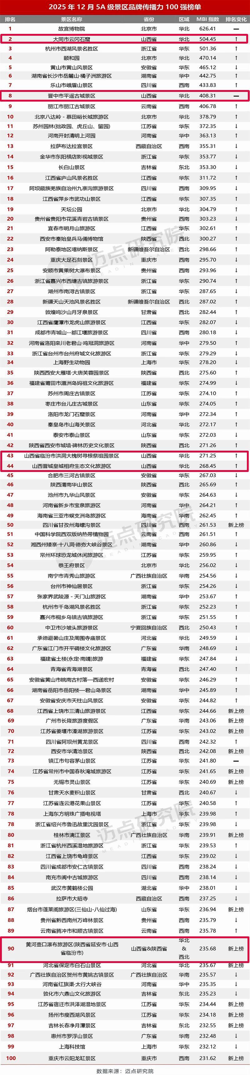 邁點(diǎn)研究院1月16日發(fā)布“2025年12月5A級(jí)景區(qū)品牌傳播力100強(qiáng)榜單”,山西省5家景區(qū)榜上有名,分別是云岡石窟、平遙古城、洪洞大槐樹、皇城相府、壺口瀑布景區(qū),其中壺口瀑布景區(qū)為新上榜。
