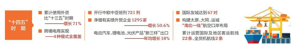 “十四五”時(shí)期,山西對(duì)外開(kāi)放的步伐堅(jiān)實(shí)有力。建立對(duì)外開(kāi)放“1+N”政策體系,全省累計(jì)使用外資比“十三五”時(shí)期增長(zhǎng)71%。服務(wù)貿(mào)易進(jìn)出口額累計(jì)達(dá)107.9億美元。外貿(mào)朋友圈拓展至158個(gè)國(guó)家和地區(qū)。外貿(mào)結(jié)構(gòu)進(jìn)一步優(yōu)化,全省凈增有實(shí)績(jī)外貿(mào)企業(yè)1295家、增長(zhǎng)50.6%,電動(dòng)汽車(chē)、鋰電池、光伏產(chǎn)品“新三樣”出口年均增長(zhǎng)18%??缇畴娚虒?shí)現(xiàn)4種模式全覆蓋。中歐中亞班列汽笛長(zhǎng)鳴,過(guò)去五年,開(kāi)行中歐中亞班列721列,一條條鋼鐵巨龍馱著山西的玻璃器皿、大型機(jī)械,通達(dá)亞歐17個(gè)國(guó)家、48個(gè)城市,讓“山西制造”與全球市場(chǎng)實(shí)現(xiàn)雙向奔赴。太重集團(tuán)生產(chǎn)的輪軸產(chǎn)品,憑借過(guò)硬質(zhì)量,已遠(yuǎn)銷(xiāo)全球60余個(gè)國(guó)家和地區(qū);山西建投的業(yè)務(wù)版圖,同樣延伸至全球60多個(gè)國(guó)家和地區(qū)。農(nóng)產(chǎn)品出口取得新突破,運(yùn)城多款果品“首發(fā)”多國(guó),大同黃花遠(yuǎn)渡重洋,藜麥粉首次擺上法國(guó)消費(fèi)者的餐桌。