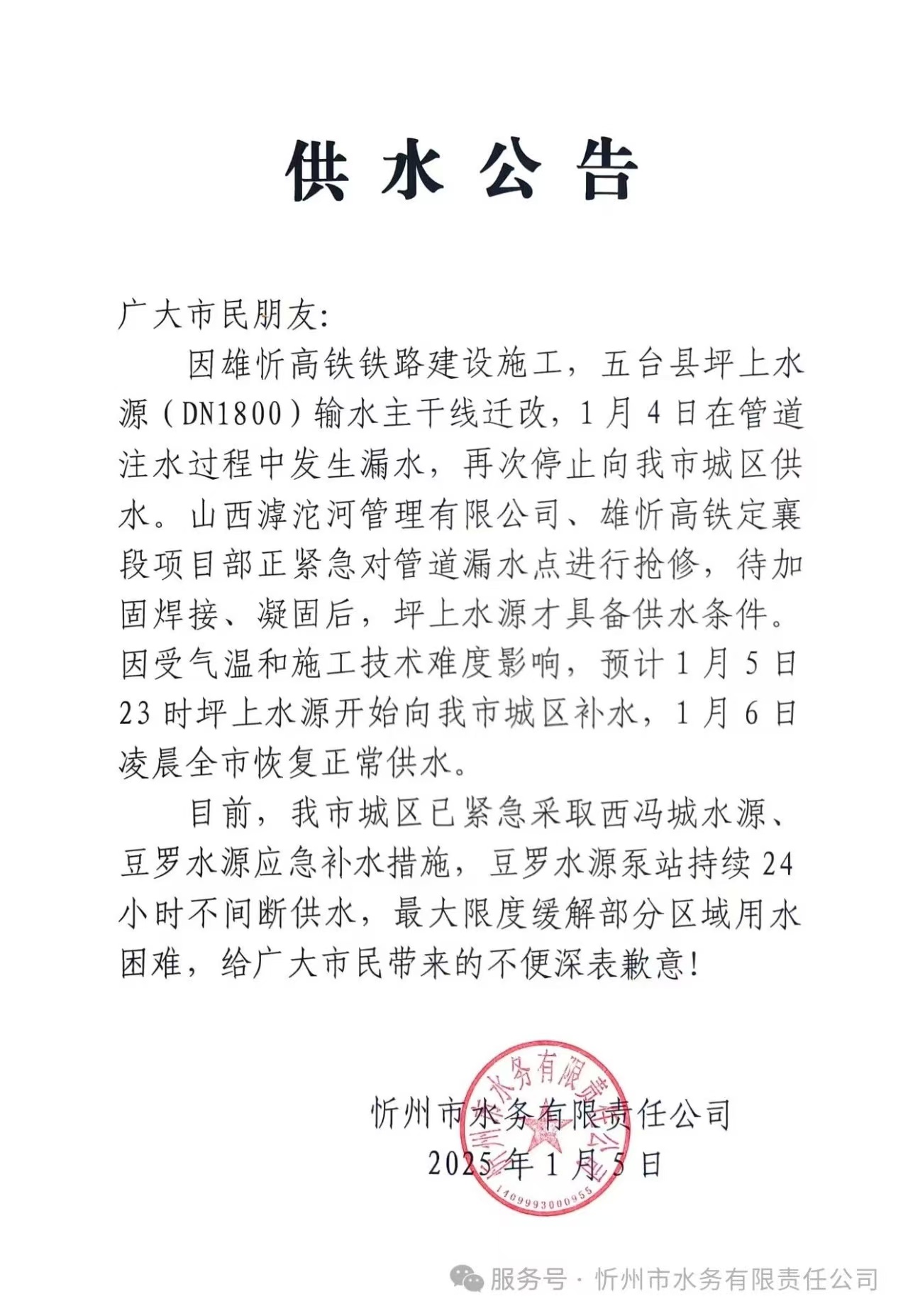 忻州城區(qū)恢復(fù)供水時(shí)間定了!