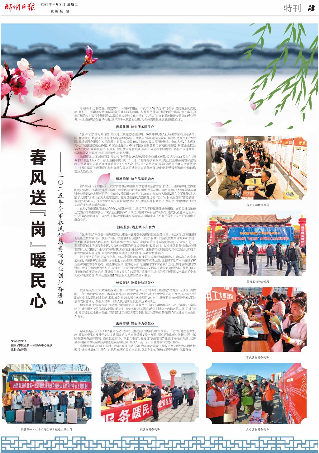 春潮涌動,萬物競發(fā)。在黨的二十大精神的指引下,我市以“春風(fēng)行動”為抓手,錨定就業(yè)優(yōu)先戰(zhàn)略,掀起了一場覆蓋全域、精準(zhǔn)施策的就業(yè)服務(wù)熱潮。從代縣文昌祠廣場的崗位“盛宴”到五寨縣迎賓廣場的鄉(xiāng)村振興專場招聘,從偏關(guān)縣太虎坡文化廣場的“龍?zhí)ь^”古會到易地搬遷安置點(diǎn)的暖心服務(wù),一場場招聘會如春風(fēng)化雨,潤澤萬千求職者的心田,為忻州高質(zhì)量發(fā)展增添蓬勃生機(jī)。