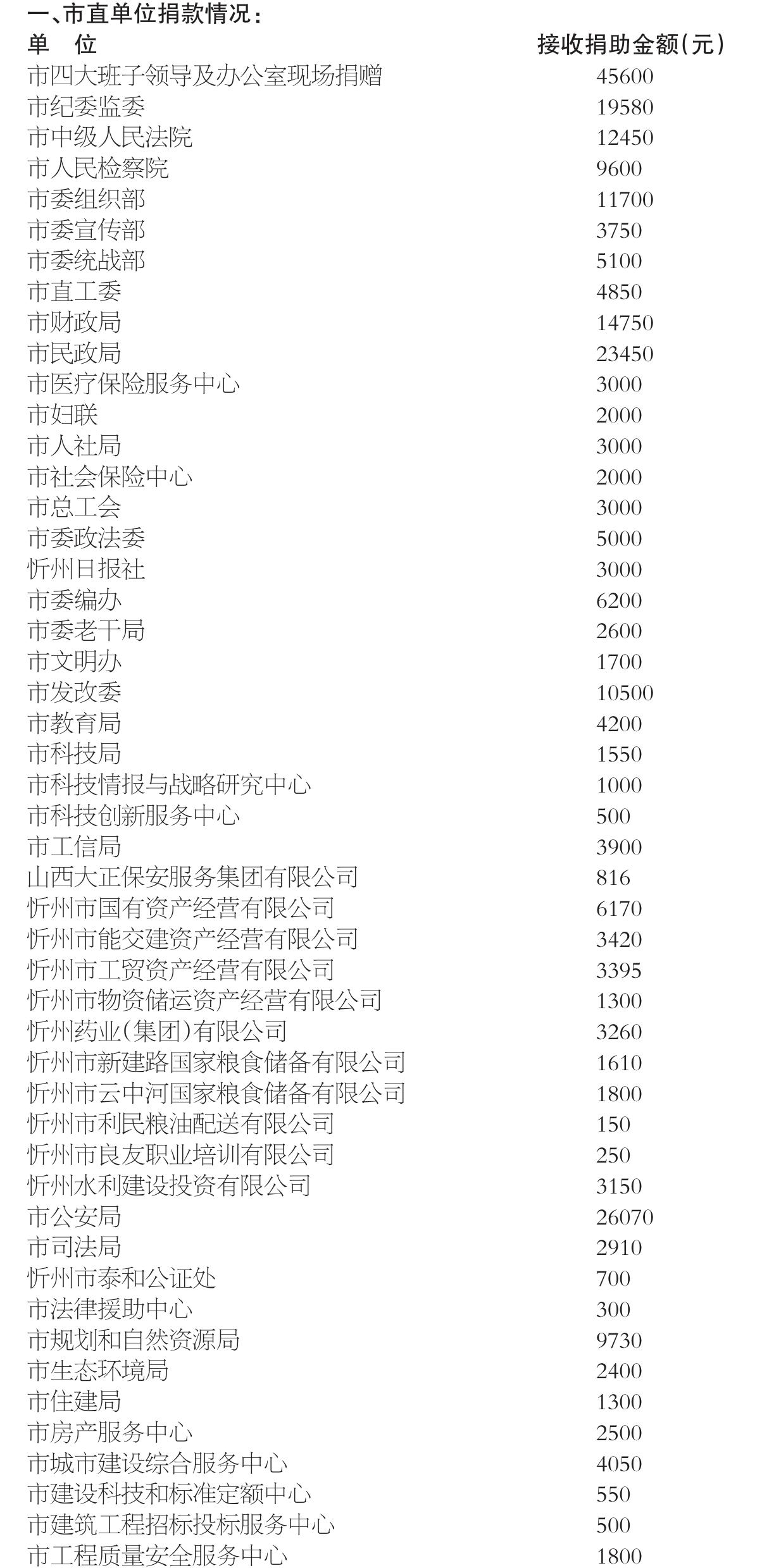 2024年11月22日,市委、市政府辦公室發(fā)出《關(guān)于開展“送溫暖、獻愛心”社會捐助活動的通知》,市四大班子領(lǐng)導(dǎo)和機關(guān)干部率先垂范,各縣(市、區(qū))、各單位高度重視,認真組織,廣大干部職工積極響應(yīng),“送溫暖、獻愛心”社會捐助活動有效開展。截至2025年4月底,市直140個單位組織干部職工參與捐助,共捐款766388元,各縣(市、區(qū))接收捐款338.09萬元,合計捐款4147288元,為解決全市人民群眾的生產(chǎn)生活問題起到了積極作用?,F(xiàn)將捐助情況公告如下(市直單位以捐助時間先后為序):