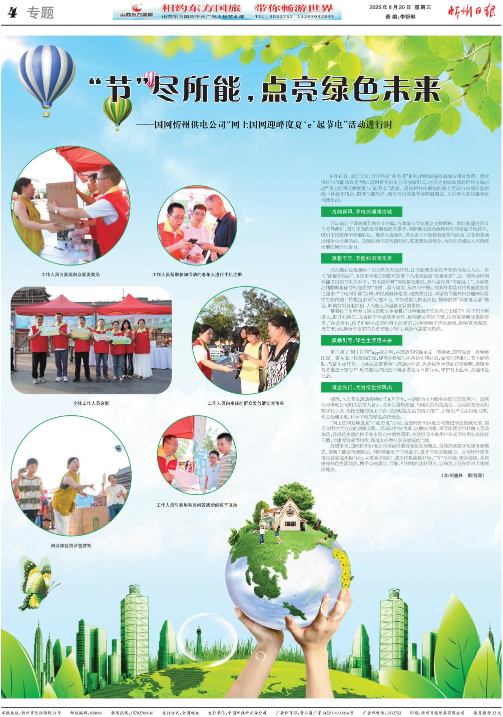 8月13日,雖已立秋,忻州仍受“秋老虎”影響,持續(xù)高溫推高城市用電負(fù)荷。面對(duì)保供與節(jié)能的雙重考驗(yàn),國(guó)網(wǎng)忻州供電公司創(chuàng)新形式,在歷史韻味濃厚的忻州古城啟動(dòng)“網(wǎng)上國(guó)網(wǎng)迎峰度夏‘e’起節(jié)電”活動(dòng)?;顒?dòng)將科技賦能的線上互動(dòng)與熱情洋溢的線下體驗(yàn)相結(jié)合,倡導(dǎo)節(jié)能風(fēng)尚,既為市民傳遞科學(xué)降溫理念,又引導(dǎo)大家共建綠色低碳生活。