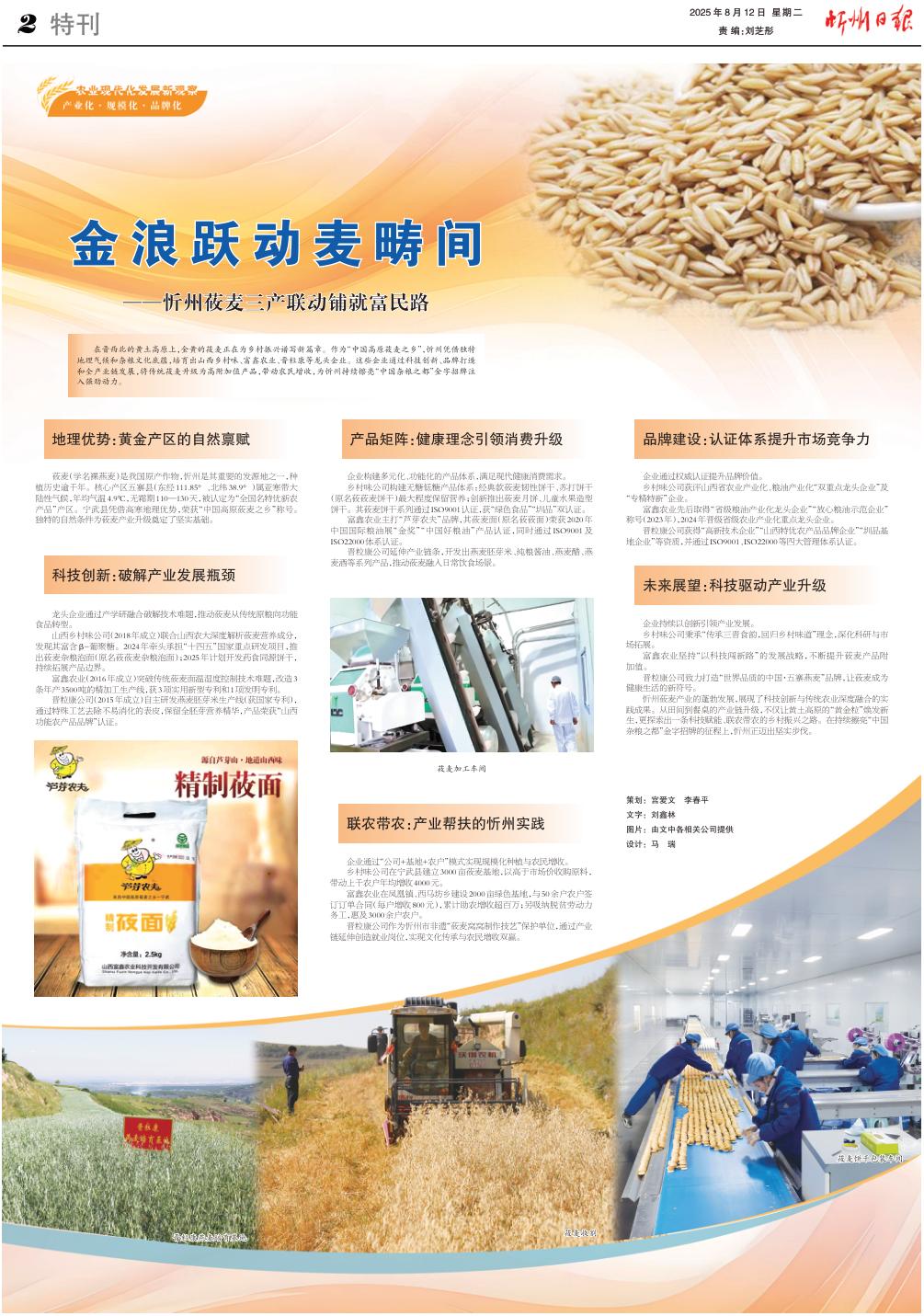 在晉西北的黃土高原上,金黃的莜麥正在為鄉(xiāng)村振興譜寫(xiě)新篇章。作為“中國(guó)高原莜麥之鄉(xiāng)”,忻州憑借獨(dú)特地理氣候和雜糧文化底蘊(yùn),培育出山西鄉(xiāng)村味、富鑫農(nóng)業(yè)、晉粒康等龍頭企業(yè)。這些企業(yè)通過(guò)科技創(chuàng)新、品牌打造和全產(chǎn)業(yè)鏈發(fā)展,將傳統(tǒng)莜麥升級(jí)為高附加值產(chǎn)品,帶動(dòng)農(nóng)民增收,為忻州持續(xù)擦亮“中國(guó)雜糧之都”金字招牌注入強(qiáng)勁動(dòng)力。