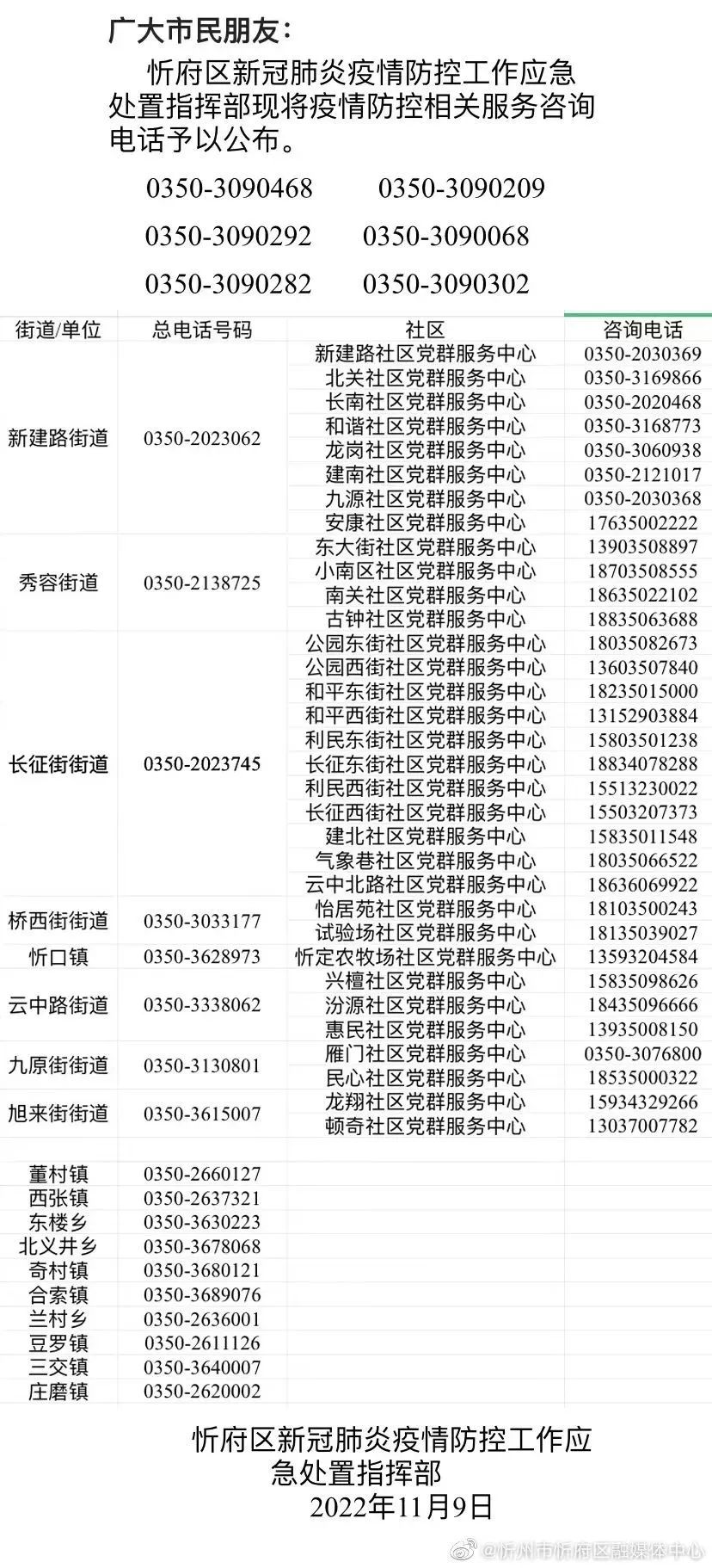 關(guān)于公布忻府區(qū)疫情防控靜態(tài)管理期間服務(wù)熱線電話的公告
