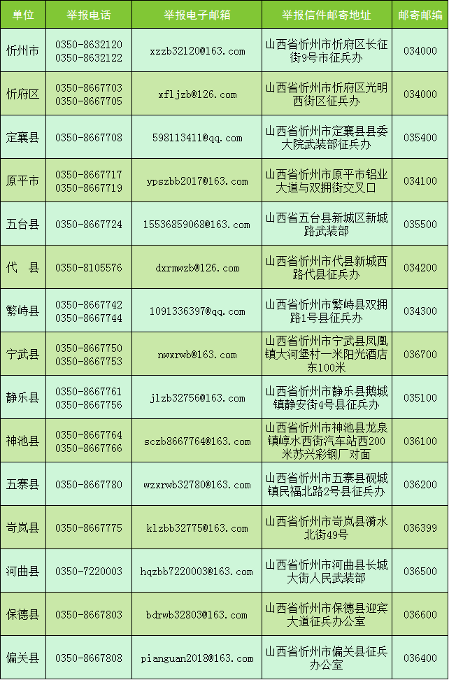為認真貫徹落實上級關于廉潔征兵的政策規(guī)定,維護廣大應征青年的合法權益,嚴明征兵紀律,拓寬監(jiān)督渠道,營造風清氣正的征兵環(huán)境,現(xiàn)將2025年忻州市級廉潔征兵監(jiān)督員和市縣兩級舉報電話、郵箱等信息予以公示,歡迎全社會對征兵工作進行監(jiān)督。