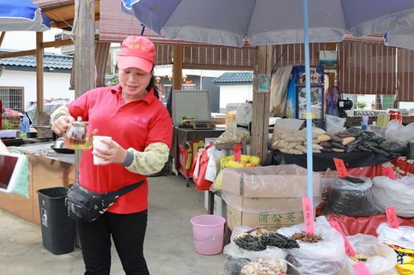 “天太熱,來(lái)喝口我這免費(fèi)的茶?!辈湃脒B樟村村口,記者便被熱情的村民陸秀媚招呼到了自己的攤位。紅茶、本地枝葉、山柑皮、筍干……她的攤位琳瑯滿目,擺得滿滿當(dāng)當(dāng)。陸秀媚告訴記者,自己曾經(jīng)在市里賣童裝,剛開(kāi)始還能掙到些錢(qián),后來(lái)隨著網(wǎng)購(gòu)興起,實(shí)體店的生意越來(lái)越難做。2018年,在習(xí)近平總書(shū)記來(lái)連樟村視察后,看到家鄉(xiāng)越變?cè)胶?,陸秀媚選擇了回到村里創(chuàng)業(yè)。