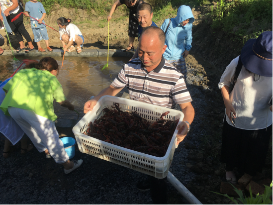 在郴州市吳山村小龍蝦養(yǎng)殖基地,一群游客圍在一個養(yǎng)蝦池邊歡笑不斷,不時響起一聲聲驚喜的尖叫,這里正在進行一場“釣蝦大賽”。