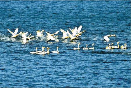 春日里的暖陽(yáng)將河水消融,雙乳湖上的白天鵝美得讓人沉醉。它們是大自然的精靈,用頎長(zhǎng)的脖頸搖撼著冬日的死寂,用輕盈的羽扇靈動(dòng)了粼粼蕩漾的河面,用點(diǎn)點(diǎn)乳白畫出了繁花似錦的春天。