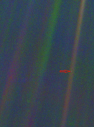 旅行者1號拍攝的太陽系中的暗淡藍(lán)點(diǎn)兒——地球。