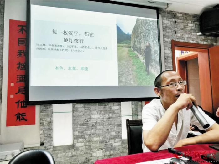 本報訊 8月15日晚,位于忻州市七一北路的好目匠眼鏡店迎來一場文學(xué)盛會。保德縣、岢嵐縣、五寨縣、原平市、定襄縣的詩歌愛好者,與忻州城區(qū)的詩歌愛好者一起聆聽了著名詩人張二棍關(guān)于詩歌創(chuàng)作的講座,甚至有詩歌愛好者專門從北京趕回忻州。當(dāng)晚,連講座廳外都站滿了聆聽的人。