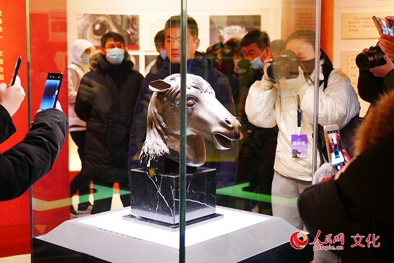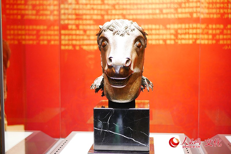 展覽現(xiàn)場(chǎng)。人民網(wǎng) 韋衍行攝 圓明園馬首銅像,為清代圓明園長春園西洋樓建筑群海晏堂外十二生肖獸首噴泉主要構(gòu)件之一。1860年英法聯(lián)軍侵入北京,圓明園慘遭劫掠焚毀,馬首銅像與其他11尊獸首銅像一同流失海外。 馬首銅像為意大利人郎世寧設(shè)計(jì),融合了東西方藝術(shù)理念與設(shè)計(jì)風(fēng)格,清乾隆年間由宮廷匠師精工制作,以精煉紅銅為材,色彩深沉厚重,以失蠟法一體鑄造成型,神態(tài)栩栩如生,毛發(fā)分毫畢現(xiàn),歷百年風(fēng)雨而不銹蝕,展現(xiàn)出極高的工藝水準(zhǔn),是一件非凡的中國古代藝術(shù)品。
