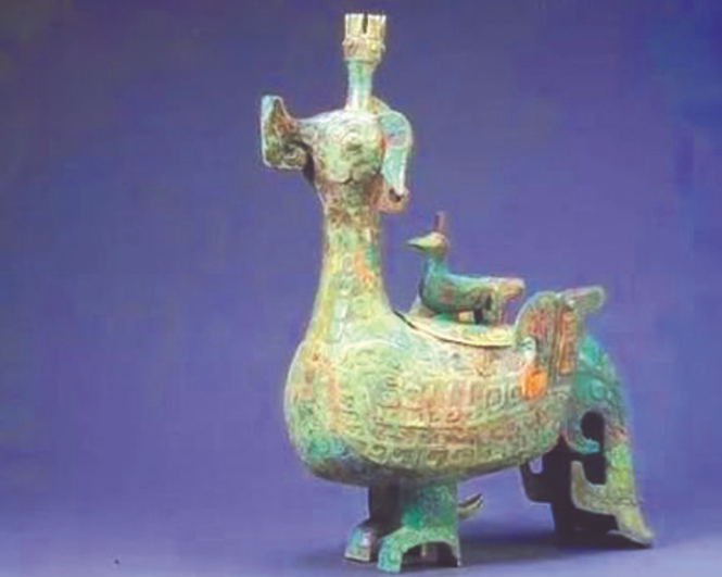 第二件是北京保利藝術(shù)博物館從海外購回、2004年曾名噪一時(shí)的“倗季鳳鳥尊”。它也是一只昂首挺立的鳳鳥形象,鳳鳥背部挺立一只小鳥。蓋內(nèi)側(cè)有銘文“倗季乍祖考寶彝”。2005年“中國十大考古新發(fā)現(xiàn)”山西絳縣橫水墓地的發(fā)掘和研究,證實(shí)了古倗國就在山西南部。那么,“倗季鳳鳥尊”的出土地也應(yīng)該是山西無疑了。
