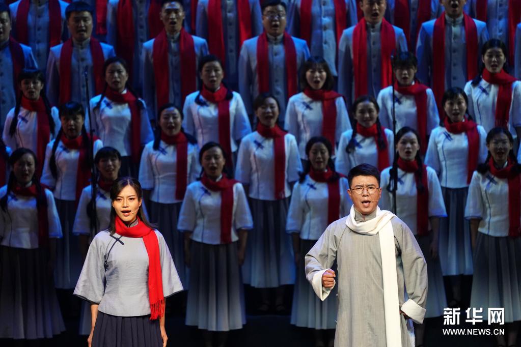 6月30日,在山西大劇院,演員在合唱《國際歌》。當日,山西省慶祝中國共產(chǎn)黨成立100周年文藝匯演在山西省太原市山西大劇院舉行。新華社記者 詹彥 攝