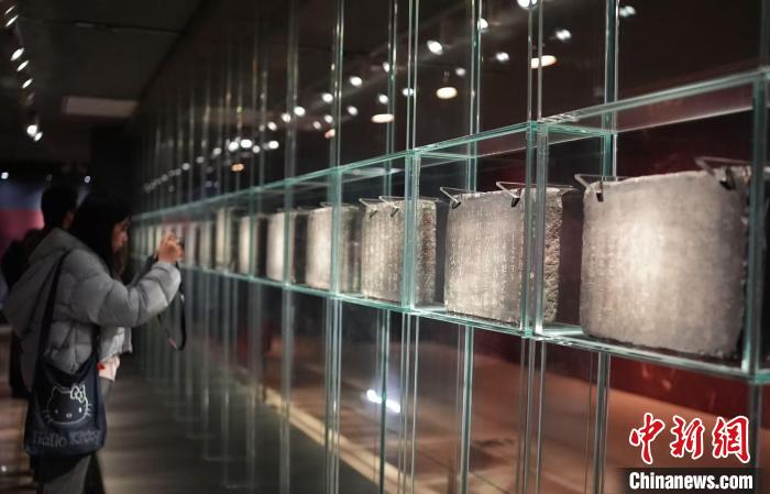 “墨韻文脈——甘肅絲路藝術(shù)珍品展”3月11日在中國美術(shù)館開幕,圖為觀眾正在欣賞明代的肅府本《淳化閣帖》刻石。 史春陽 攝
