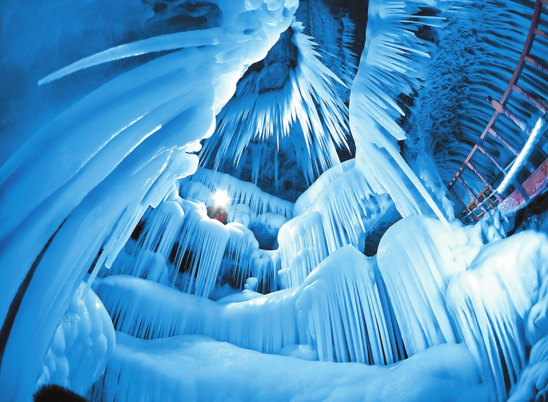 洞窟中,冰柱、冰瀑、冰簾等景觀千姿百態(tài),或玲瓏剔透,或雄偉壯觀,構(gòu)成一個鬼斧神工的冰雪殿堂,2005年,被評為國家地質(zhì)公園。更為神奇的是,與之僅一嶺之隔的“火焰山”卻地?zé)嵴趄v,常年溫?zé)?。這種極端的自然現(xiàn)象在同一山體并存,堪稱地質(zhì)學(xué)上的奇跡,吸引著無數(shù)科考人員和游客前來探秘。