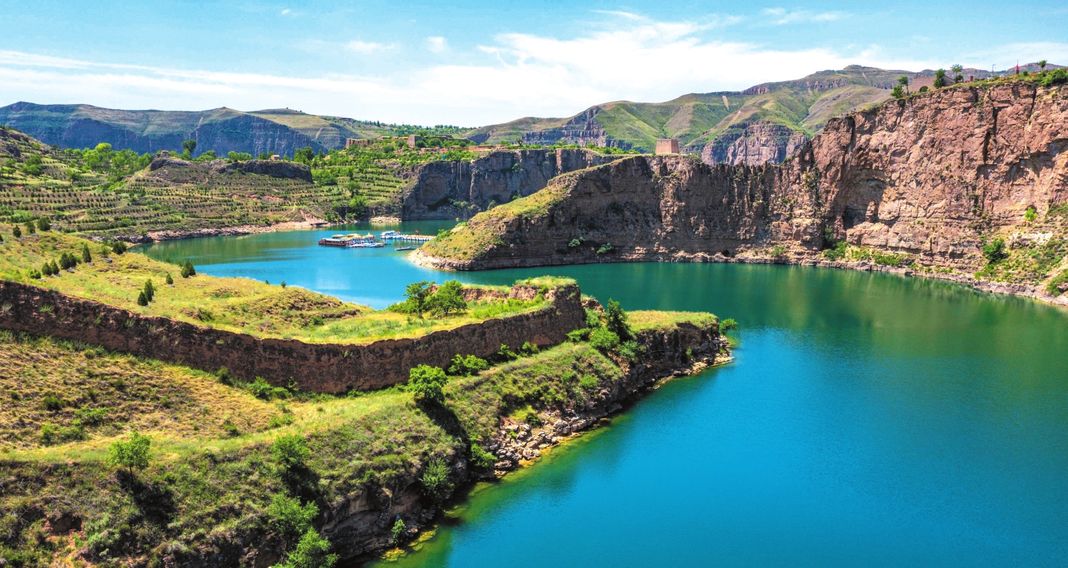 從磧口繼續(xù)下行,走過石樓灣、乾坤灣,黃河依舊清澈不染。站在山上看下去,深深峽谷里,黃河宛若一條綠色緞帶,溫柔盤旋于峽谷中。歷史上,黃河奔騰咆哮,穿高原,裂峽谷,卷泥走石,何其壯也!而今變?yōu)橐缓忧辶鳎袢缤粋€(gè)小姑娘,這情景,讓人感覺有幾分夢(mèng)幻。