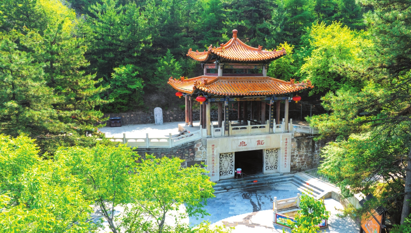 山有水而媚,土得水而沃。從大雄寶殿出來,沿著西門旁一條小道不遠(yuǎn)處,就是那片號稱“天柱松濤”的松林了。只見樹干筆直,枝條蒼勁,直指云霄,林間松脂飄香,氣息悠然。人還在松林中流連尋芳,遠(yuǎn)遠(yuǎn)就能聽到聞名已久的“天柱龍泉”在流淌。龍泉位于景區(qū)廟群西南的龍泉閣,作為“靜樂舊八景”之首的“天柱龍泉”,又名“犬舐泉”,《魏書》載:“爾朱榮高祖羽健居北秀容川。會有狗舐地,因而穿之,得甘泉,故名。”相傳泉中出神龍,故名龍泉。高山出泉是為奇觀,泉水清澈見底,旱不涸、澇不盈,夏飲清神,冬飲沁心。有“天柱圣境啟心智,龍泉奇觀令神怡”之頌。此泉水富含多種礦物質(zhì)和微量元素,是地地道道的“天然級礦泉水”。近幾年上山鍛煉的居民很多,人們上山時自帶裝水工具,攜泉水以做飯和飲用,期盼著龍泉水能給人帶來健康和好運(yùn)。站在龍泉邊,總能感受到一陣陣濕潤的水氣撲面而來,甚至像風(fēng)一樣輕繞著周身,使人置身于自然美景中不愿離開,連呼吸也變得無比暢快起來。