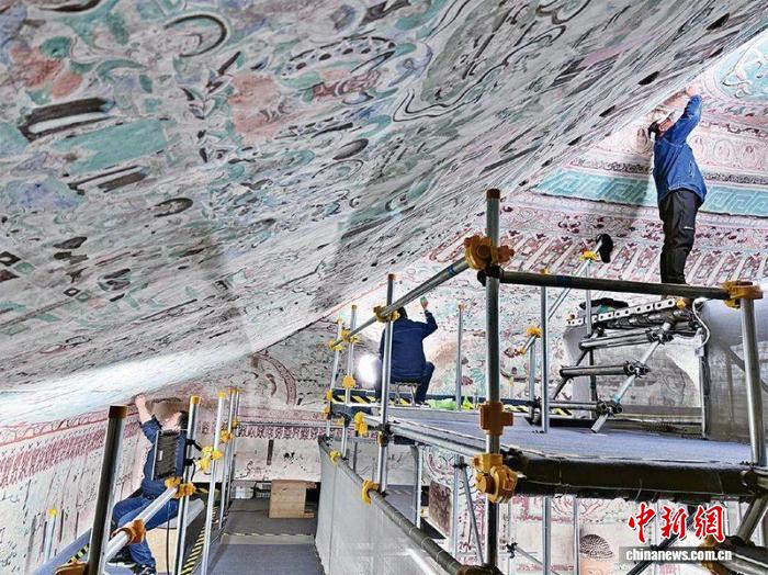 圖為2024年拍攝的莫高窟第55窟文物修復(fù)現(xiàn)場(chǎng)。(資料圖,敦煌研究院供圖)