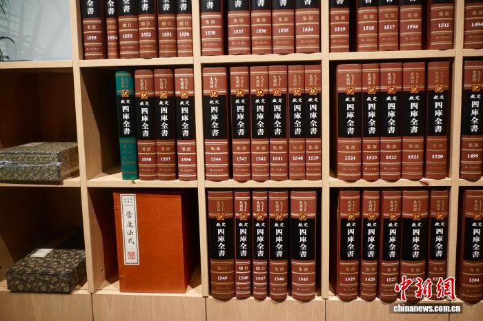 展覽展出的文瀾閣《四庫全書》精裝影印本。李嘉茵 攝