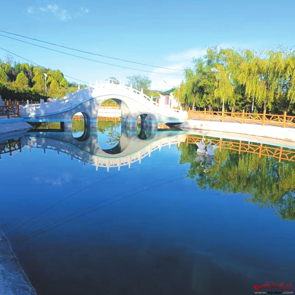 沿路而下,過橋爬坡,便到了天鵝湖。誰能想到,這碧水涵虛的景致,原是當(dāng)年造林蓄水的大水坑?工程完工后順勢(shì)修整,竟成飛龍山又一勝景。天鵝湖呈葫蘆狀,漢白玉拱橋橫跨腰間如玉帶,橋東石雕飛龍昂首欲飛,橋西石雕雙鵝戲水憨萌。湖水清澈見底,倒映藍(lán)天白云綠樹,風(fēng)過時(shí)漣漪擴(kuò)散,美得讓人心醉,連時(shí)間都慢了下來。