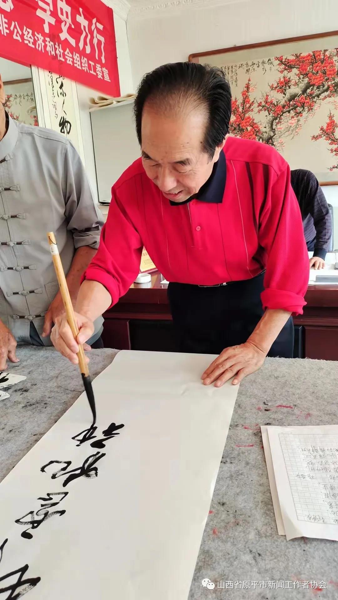 活動(dòng)現(xiàn)場(chǎng),大家暢所欲言,紛紛聯(lián)系思想實(shí)際,交流了學(xué)習(xí)黨史、明理知進(jìn)的心得體會(huì),圍繞學(xué)史長(zhǎng)知、學(xué)史明理、學(xué)史增信、學(xué)史興業(yè)進(jìn)行了熱烈討論。接著,書畫藝術(shù)組的書法家亢銀中、趙存仁、王玉伍、張正山、王福歲、王弘新,及學(xué)會(huì)顧問(wèn)書畫名家溫樹森老師、以及特邀書畫名家李晉復(fù)先生,紛紛揮毫潑墨,書寫出學(xué)習(xí)黨史的感悟與名言。大筆揮灑中,一幅幅寫有“賡續(xù)精神血脈、傳承紅色基因”“明理增信.崇德力行”“不忘初心、牢記使命”和“江山就是人民、人民就是江山”等字樣的真、草、隸、篆、行書藝作品,從筆下飄然而出。墨香中呈現(xiàn)出各有千秋、韻味感人的風(fēng)格,博得觀賞者們的點(diǎn)贊稱道,并爭(zhēng)相拿到一幅贈(zèng)品。書法家們顧不上喝水,整整忙了一個(gè)上午。特別是書畫藝術(shù)組組長(zhǎng)李文光,由于平時(shí)在廣州忙于接送孩子上學(xué),放暑假回原平后特地趕來(lái),高興地跟大家一起切磋書藝、展示才藝。書法家們還探討了書法藝術(shù)融入社會(huì)、融入黨性、服務(wù)大眾、服務(wù)中心的蹊徑、舉措與打算。(賈宣生 王福歲)
