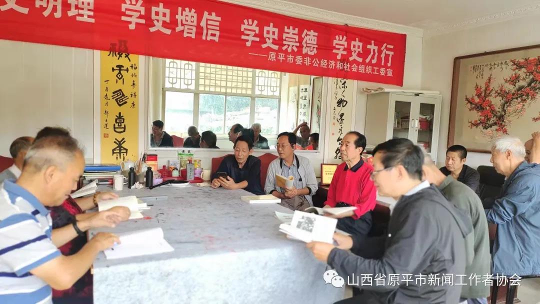 近日,原平市老年新聞文化學(xué)會(huì)組織開展了一次以學(xué)黨史悟思想為主旨的專題筆會(huì)活動(dòng)。學(xué)會(huì)會(huì)長(zhǎng)楊愛(ài)英、學(xué)會(huì)黨支部書記劉興良跟學(xué)會(huì)書畫藝術(shù)組成員一起,在這秋高氣爽、陽(yáng)光燦爛的日子里,以滿腔熱情來(lái)到學(xué)會(huì)辦公中心柳巷牡丹園,參加了這一集研討和書法于一體的別開生面的活動(dòng)。學(xué)會(huì)文化合作單位增壽口腔、金色童年、萬(wàn)源石雕與奶爸奶媽等單位人員,以及部分書畫愛(ài)好者共近50人,共同分享了書藝交流的喜悅。