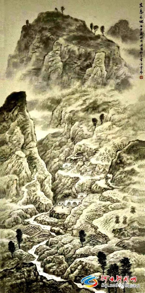 河曲新聞網(wǎng)特稿:不識黃土真面目,只緣生在此山中?非也,至小土生土長在黃土高坡的周建國,卻用繪畫來識別黃土高坡的厚重和秀麗。從他的繪畫里表現(xiàn)出來的滄桑之美正是在他經(jīng)歷了人事浮沉后所潛心追求的別樣山水畫風。大美之美固然可畏,但是他給我們看到的卻是那種能給人浩然氣勢的自然大美,美在高山,美在深水。
