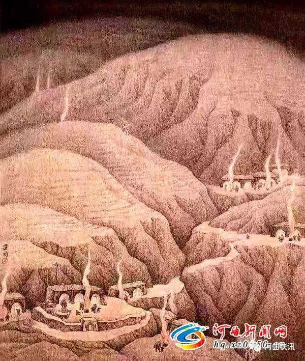 你看,窯洞前沖天的火柱,歡騰的男男女女,老老少少……一切都是如夢、如幻、溫馨、細膩、生機勃勃而又那么單純、自然……作品精工寫實,整體上卻又有圖案化的簡潔,大塊面的融入無邊黑夜的“塬”占據(jù)畫面的主體,形成一種渾厚、蒼茫的氣氛,象征著一種太古和永恒,而點綴其間的嫋嫋升騰的除夕旺火又使這蒼茫的古“塬”富有生機。