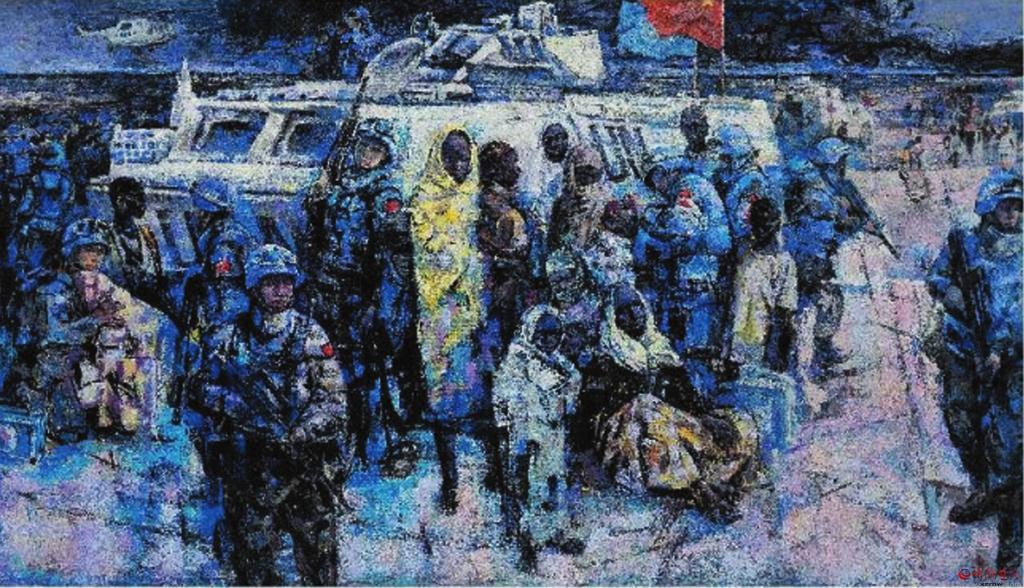 在續(xù)鶴賢眾多的作品中,從畫面表現(xiàn)效果方面,我是比較喜歡《和平使命——藍(lán)色交響曲》這幅作品的。無論畫面構(gòu)圖、色彩關(guān)系,還是人物造型以及表現(xiàn)技巧,都堪稱完美。畫面中無論人物形象、動態(tài)、表情,還是人與自然背景,都處在一種和諧美好的關(guān)系中,從一個新的角度給予美好詮釋。這幅作品表現(xiàn)的是我們的維和部隊“子弟兵”以自己的生命守護(hù)著世界和平,講述著構(gòu)建人類命運共同體的大國情懷。 (邢晨聲 文)