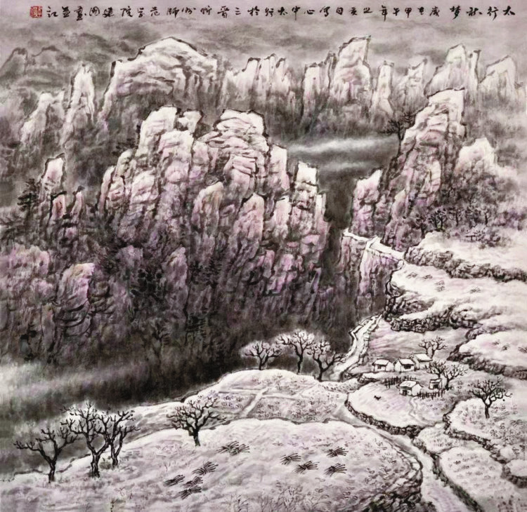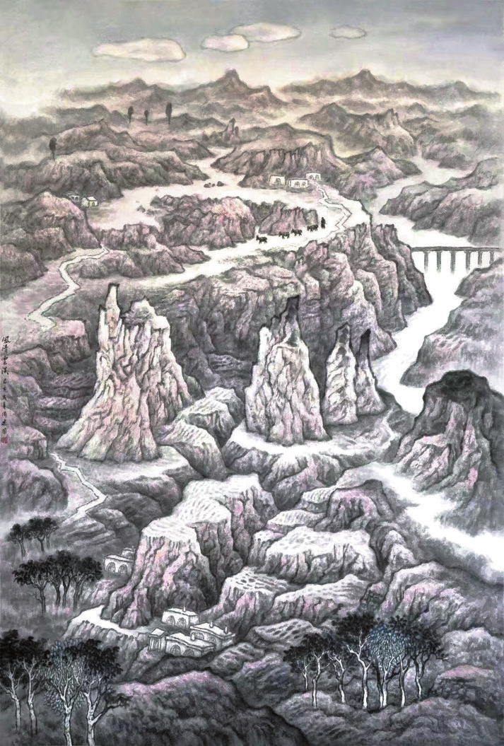 周建國對中國山水畫有著獨特見解,出版過畫集《中國美術(shù)名家精品鑒賞·周建國作品集》。他的創(chuàng)作之路主要分為兩個時期,前期追求中西融合,后期則回歸傳統(tǒng)。前期作品《曉月》《古原除夕》《月色》等,多取材于黃土高原,真切流露出其對黃土地的深情厚愛:早上飄起的炊煙演繹著百姓的勤勞,喧鬧的腰鼓彰顯著鄉(xiāng)民熱愛生活的豪情,晨起上課的學(xué)生更是承載著當?shù)厝藵M滿的希望。周建國將黃土地上的一草一木皆升華為獨特且富有個性的生命體,畫面處理側(cè)重將西方油畫的光影巧妙融入作品,寓動于靜,動靜相宜,彰顯“高貴的單純,靜穆的偉大”的內(nèi)在張力。同時將傳統(tǒng)山水繪畫的造型、空間結(jié)構(gòu)、筆法設(shè)色皆進行改變——黃土溝壑的幾何化處理、筆墨色調(diào)的反復(fù)拿捏、耐人尋味的空間布局,都體現(xiàn)了其特殊的創(chuàng)作理念。相較前期,周建國后期的作品更加注重對內(nèi)在美的挖掘,如《風月同天》《家園》《和諧家園》《生息之地》《太行月色》等代表作品,表達對祖國山河大川的熱愛,走“外師造化,中得心源”之道,畫風趨向率真,試圖突破中國山水繪畫的表象審美,追尋深層意義的表達。