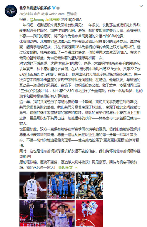 林書(shū)豪個(gè)人社交平臺(tái)視頻截圖 人民網(wǎng)北京9月15日電(楊喬棟)15日,林書(shū)豪通過(guò)個(gè)人社交平臺(tái)發(fā)布自制視頻宣布,下個(gè)賽季將不再代表北京首鋼男籃征戰(zhàn)CBA賽場(chǎng),而將繼續(xù)尋求征戰(zhàn)美國(guó)職業(yè)籃球聯(lián)賽的機(jī)會(huì)。林書(shū)豪在視頻中稱,最近四周都在思考下一步的規(guī)劃,但是最終還是忍痛做了一個(gè)艱難的決定——暫時(shí)告別CBA,“我決定今年(下個(gè)賽季)不回首鋼去打球,這個(gè)決定是我人生最難的一個(gè)決定?!彪S后,北京首鋼男籃通過(guò)官方微博發(fā)布長(zhǎng)文,在確認(rèn)林書(shū)豪“離開(kāi)”的同時(shí)也第一時(shí)間為其送上祝福。北京男籃官宣全文如下: 一年很短,短到還沒(méi)來(lái)得及回味就說(shuō)再見(jiàn);一年很長(zhǎng),長(zhǎng)到那些點(diǎn)滴相處如珍珠般串起綿長(zhǎng)的回憶,烙在你我的心間。遺憾,卻仍要鄭重地告訴大家,新賽季林書(shū)豪——我們的豪哥,將不會(huì)作為北京首鋼男籃的外援出戰(zhàn)CBA比賽。 休賽期以來(lái),北京首鋼籃球俱樂(lè)部與林書(shū)豪及團(tuán)隊(duì)保持良好的溝通交流,誠(chéng)邀書(shū)豪一起攜手繼續(xù)征戰(zhàn),并在書(shū)豪返回CBA為前提的續(xù)約合同上雙方達(dá)成共識(shí)。經(jīng)過(guò)反復(fù)斟酌,林書(shū)豪做出了一個(gè)艱難的決定:他希望再次嘗試回到NBA,在這個(gè)最高的籃球殿堂,為自己最執(zhí)著的籃球理想再拼搏一次。 對(duì)夢(mèng)想的不懈追逐,這是“林瘋狂”的源起,也是北京首鋼與林書(shū)豪牽手的關(guān)鍵點(diǎn)。去年夏天,林書(shū)豪加盟北京首鋼,在43場(chǎng)比賽中場(chǎng)均出場(chǎng)32.9分鐘,貢獻(xiàn)22.7分5.6籃板5.6助攻1.9搶斷。在場(chǎng)上,他用出色的大局觀冷靜理智地組織進(jìn)攻,用一次次奮不顧身沖擊籃筐的表現(xiàn)帶領(lǐng)球隊(duì)走向勝利;在場(chǎng)邊,他與隊(duì)友、與球迷的互動(dòng)是一道溫馨的風(fēng)景線;在場(chǎng)下,他積極投身公益,敢于發(fā)聲,疫情期間以及“三分心”公益項(xiàng)目中,林書(shū)豪個(gè)人和團(tuán)隊(duì)進(jìn)行了大量捐款。作為一名運(yùn)動(dòng)員,他的追求和精神是值得所有人尊敬的。 這一年,我們共同經(jīng)歷了每場(chǎng)比賽的每一個(gè)瞬間,我們共同享受著勝利的喜悅,共同承擔(dān)著失敗的落寞,我們共同分享著來(lái)源于球迷們,來(lái)源于彼此之間的愛(ài)與勇氣。球迷們毫不吝嗇所有的掌聲和歡呼,球隊(duì)的兄弟們既與林書(shū)豪在場(chǎng)上互相支撐,更是可以私下共同出游、坦誠(chéng)相待的伙伴——林書(shū)豪與北京首鋼已融為一家人。 也正因如此,雙方一直保有能夠在新賽季再次攜手的愿景,但我們也能夠理解并尊重林書(shū)豪最終的決定,尊重一位運(yùn)動(dòng)員在職業(yè)生涯的每一分每一秒都不曾放棄,不惜一切代價(jià)地追逐最高理想——他完美地詮釋了“更高更快更強(qiáng)”的體育精神。 同時(shí),這也是北京首鋼籃球俱樂(lè)部永恒不變的信條,我們將懷揣北京首鋼精神繼續(xù)前進(jìn)! 愿前程似錦,愿功不唐捐,愿追夢(mèng)人終將收獲!再見(jiàn)豪哥,期待有機(jī)會(huì)再續(xù)前緣,我們永遠(yuǎn)是一家人!